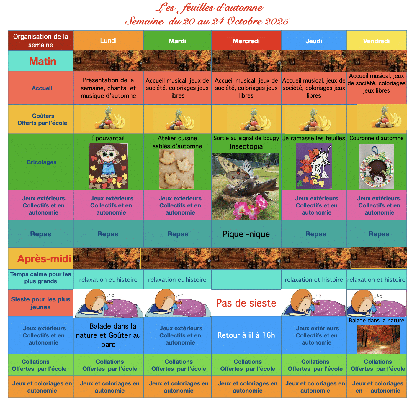 Le programme proposé est riche, varié et les animations sont pensées et mises en place afin de favoriser l’autonomie et l’épanouissement de tous les enfants. Encadrés par une équipe dynamique, créative et à l’écoute, les enfants pourront s’adonner, tout au long de la semaine et dans un cadre sécurisé, à de nombreuses activités parmi lesquelles coloriages, bricolages, atelier cuisine, jeux collectifs, chants et balades/sorties. Un temps calme (pour les plus grands) ou pour faire la sieste (pour les plus petits) est également prévu après le repas du midi.