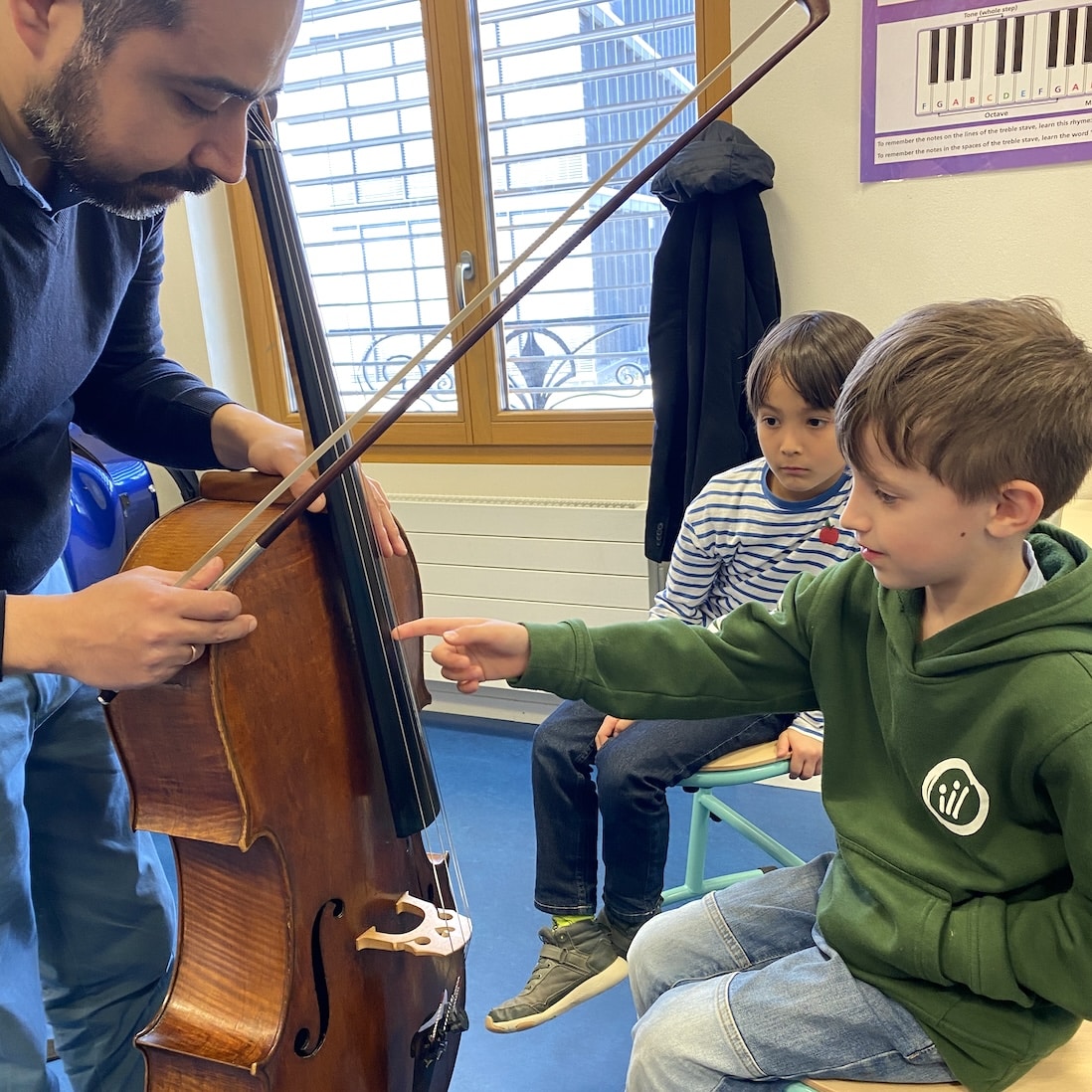 enfant au cours de music découvre la contrebasse mais aussi d’autres instruments